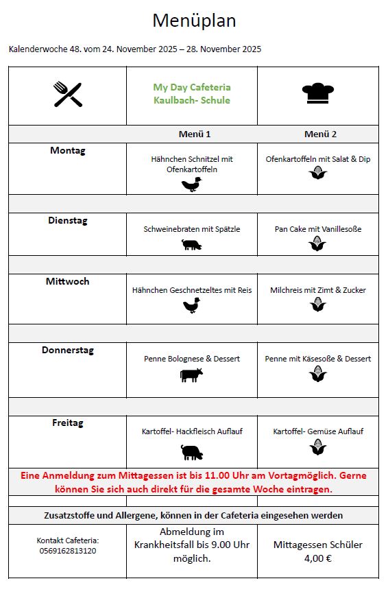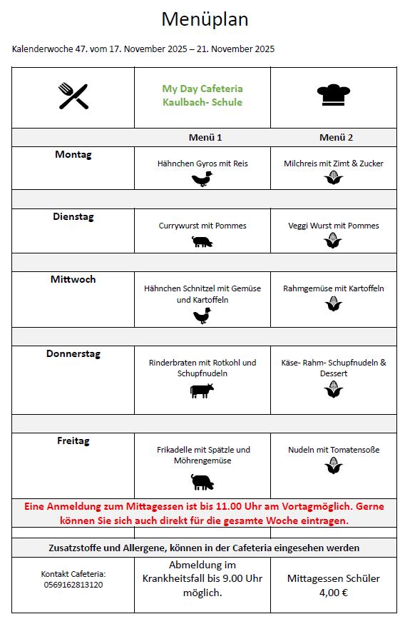 In unserer Cafeteria gibt es zusätzlich zu den bewährten Vormittag-Snacks warmes Mittagessen zum Preis von 4,00 €. Der Bonkauf erfolgt im Voraus, muss aber bis spätestens 11:00 Uhr am Vortag in der Cafeteria getätigt werden.