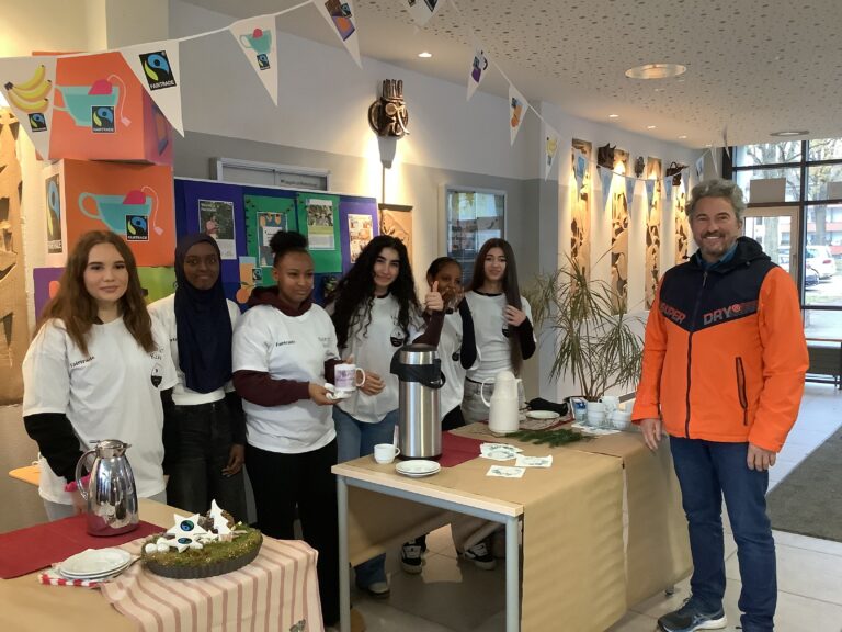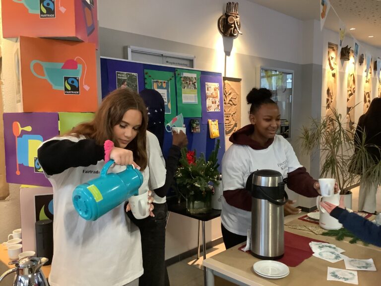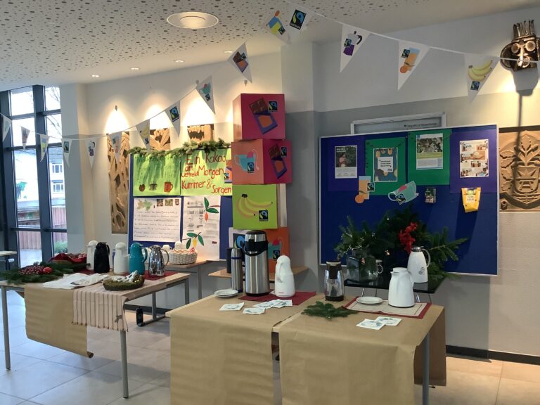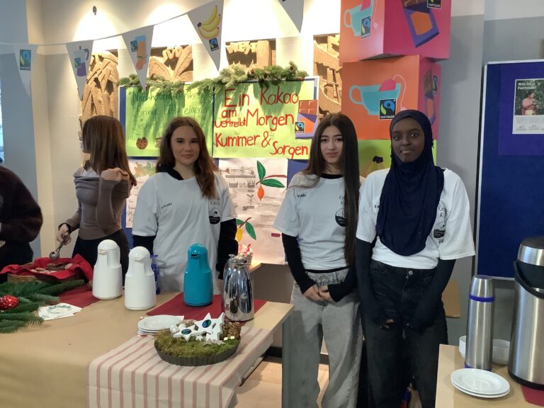 Die Fairtrade-AG unserer Schule beteiligte sich auch dieses Jahr bei der Kakaokampagne „Sweet Revolution“, die vom 01.- 24.12 stattfindet. In der Eingangshalle der Kaulbach – Schule wurden am 03.12.2025 Kakao aus fairen Handel, Bio-Fair-Trade-Schokoladen und Bio-Fair-Trade-Lebkuchen an unsere Schülerschaft verschenkt. Die Kampagne setzt sich dafür ein, dass Schokolade aus fairem Handel nicht nur ein Genuss, sonders auch ein Zeichen der Solidarität ist. Schokolade macht glücklich und wird besonders gern zu Anlässen wie Weihnachten, Geburtstagen oder als kleines Dankeschön verschenkt. Doch ihr wichtigster Inhaltsstoff, der Kakao, besitzt eine lange Geschichte der Ausbeutung von Mensch und Umwelt. Urwälder wurden durch Monokulturplantagen ersetzt. Die arbeitende Landbevölkerung erhält nur Hungerlöhne für die Knochenarbeit auf den Feldern. Der Bio- Fairtrade- Kakao verhindert die Ausbeutung von Mensch und Natur. Gemeinsam mit der „Sweet Revolution“ Kampagne sorgt die Fairtrade- AG dafür, dass die Weihnachtszeit nicht nur süß sondern auch gerecht ist und die Kakaobäuerinnen und Kakaobauer weltweit unterstützt werden.