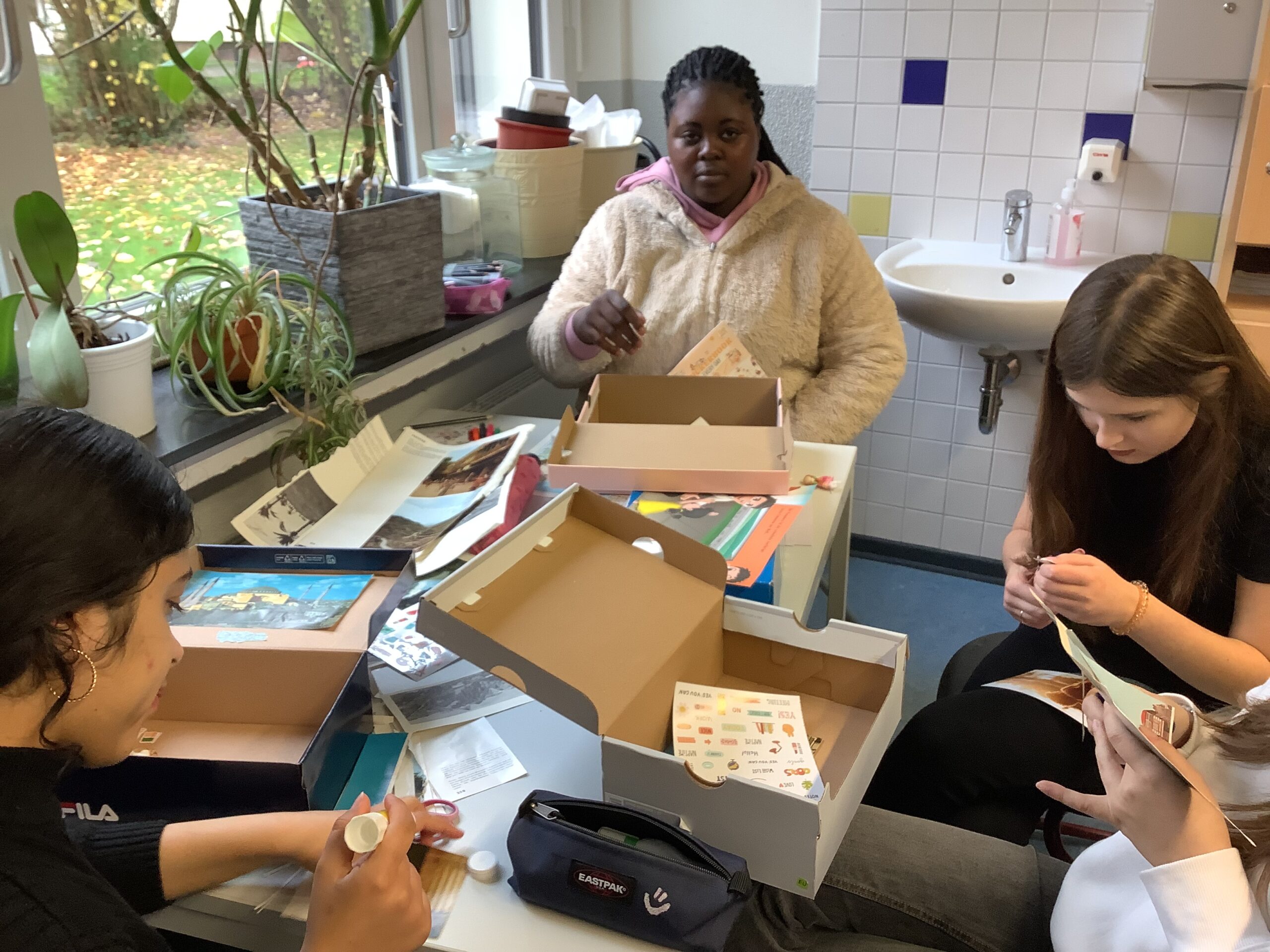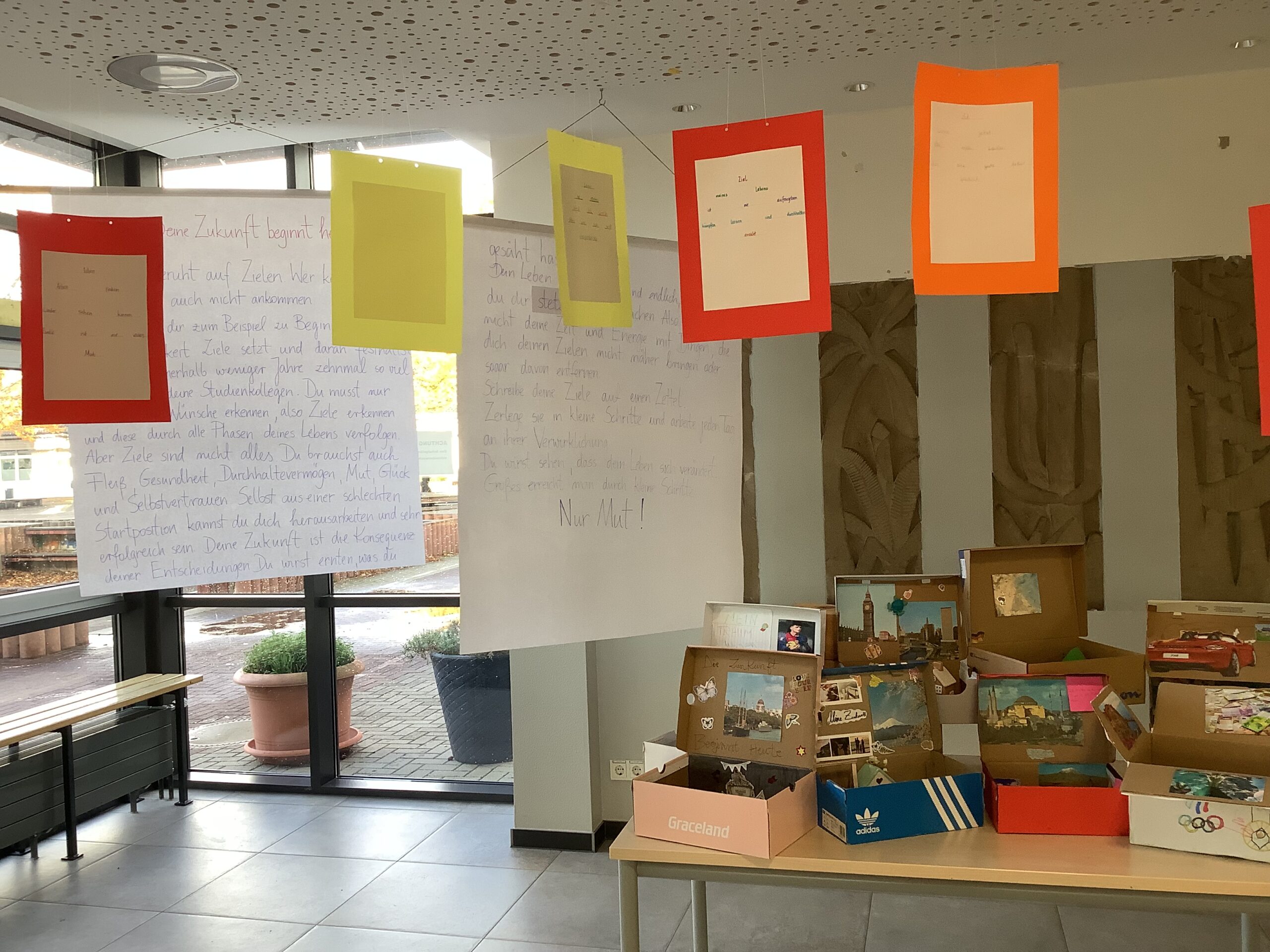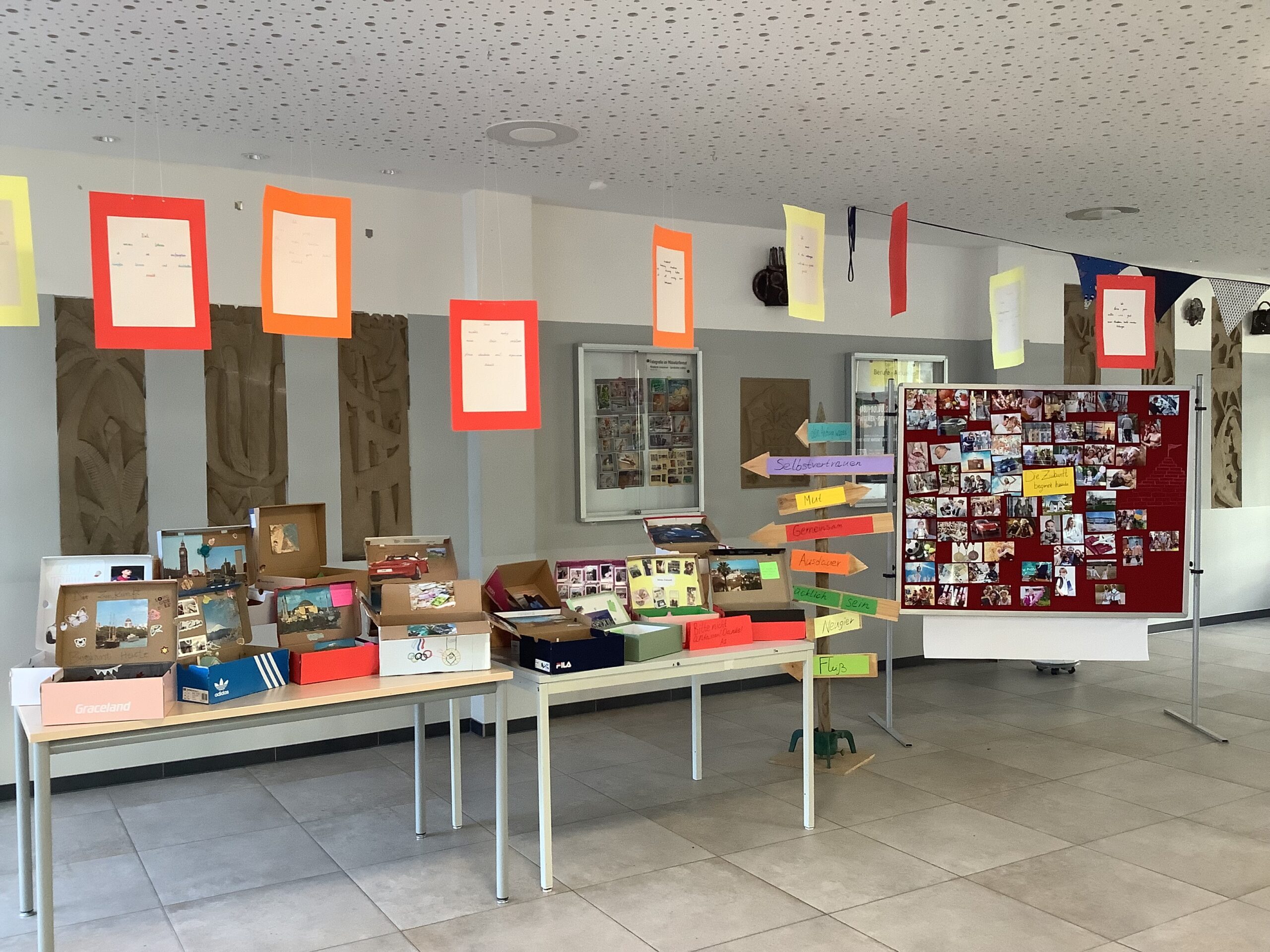 In einer Ausstellung in der Eingangshalle der Schule konnte sich die gesamte Schulgemeinde über die Arbeitsergebnisse der Sprachklasse informieren und daran teilhaben.